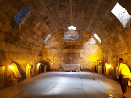 The chamber—where the temple priests would descend to deliver oracles and where offerings presented to the temple were stored—has been illuminated, as have the funerary steles arranged within.