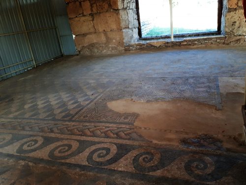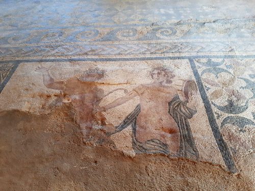 Among the surviving mosaics on the bathhouse floor, figures of Satyrs and Maenads can be discerned.