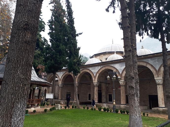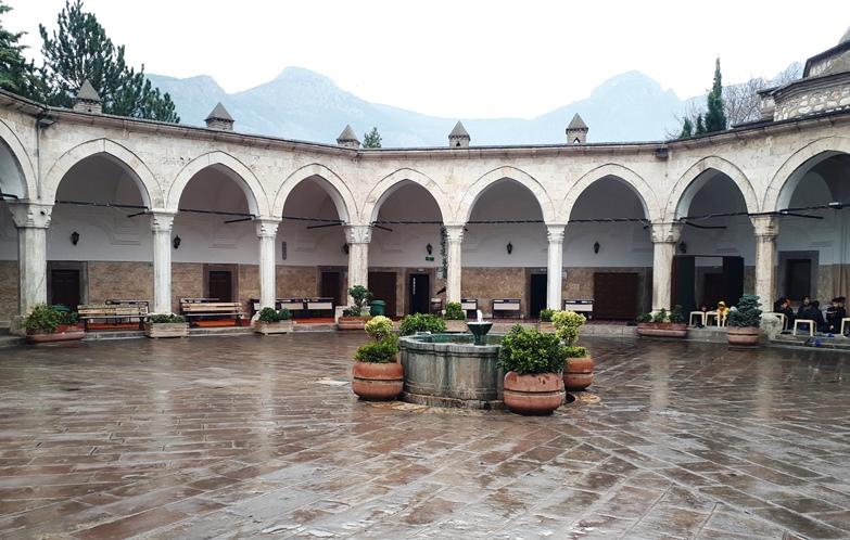 Avluda yeşil çimler ve asırlık ağaçların ortasında ince sütunları olan zarif bir şadırvan bulunuyor. Avlu ortasında yer alan 12 kenarlı şadırvan, 12 sütunun taşıdığı, 12 yüzlü sivri piramit bir çatıyla örtülü.