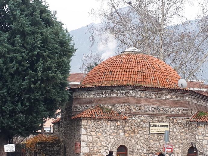 Köprüden karşıya geçince, günümüzde de kullanılan ve taş kubbelerinden beyaz dumanlar yükselen Kumacık Hamamı görünüyor.