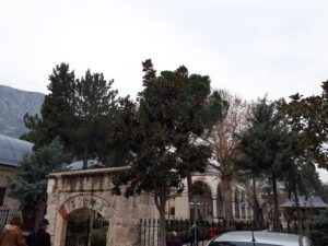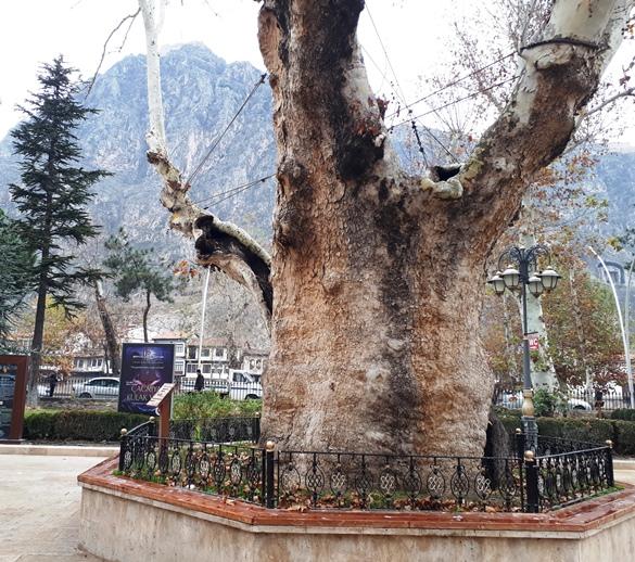 Avluda asırlık bir çınar var ve bu çınar yukarıdan aşağıya dilim dilim bölünmüş gibi duruyor. Yıllarca paratoner görevi görüp yıldırımları üzerine çekmiş ve etraftaki binaları korumuş.