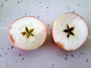 Amasya elması küçük, kırmızı beyaz formu ve tadı ile özgün bir elma çeşidi. Ancak bu gezide bir şey daha öğrendim. Sadece Amasya elması yatay olarak ortadan kesildiğinde içinden yıldız şekli çıkıyormuş.