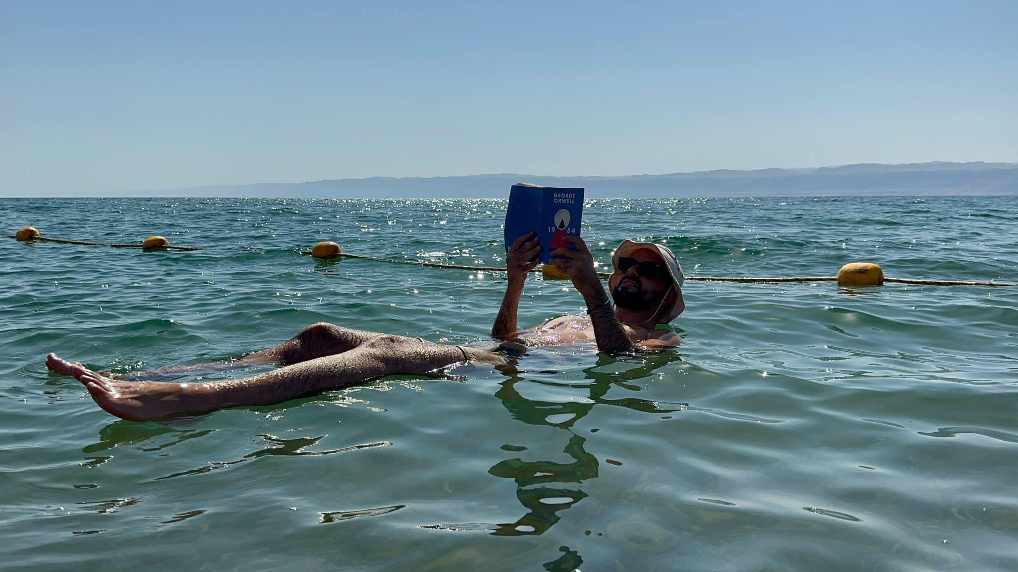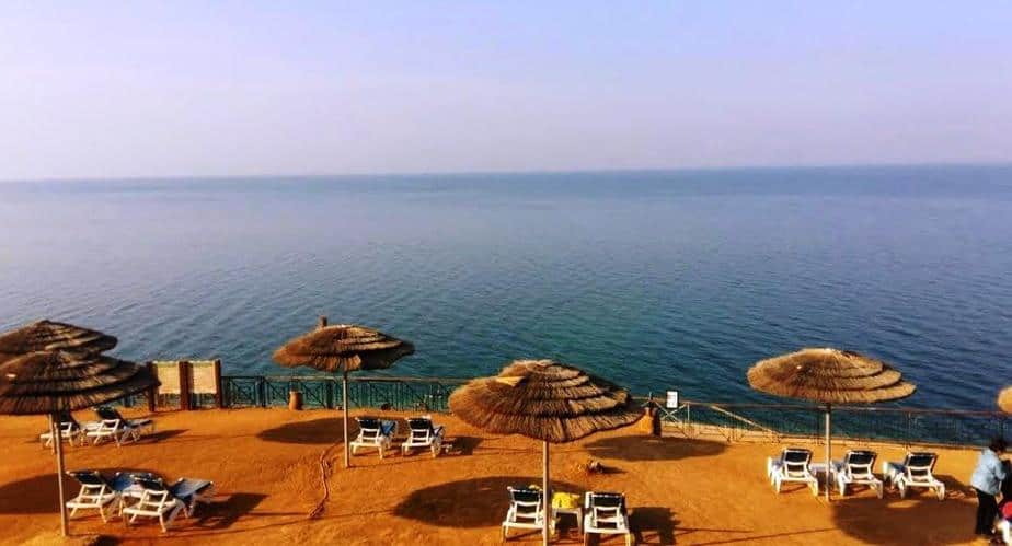Deniz seviyesinin 420 metre altıda bulunan Lut Gölü kıyısında; plaj şemsiyelerinin altında şezlonglara uzanıp, manzarayı seyrederken gölün karşı tarafı İsrail kıyıları.