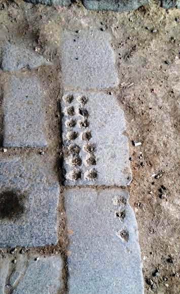 Yol kenarında birleşim noktalarında taş oyularak oluşturulmuş kanalizasyon delikleri görünüyor. Yol iki tarafa hafif eğim verilerek yapılmış, yağmur sularının ortada birikmesini önlemek için.
