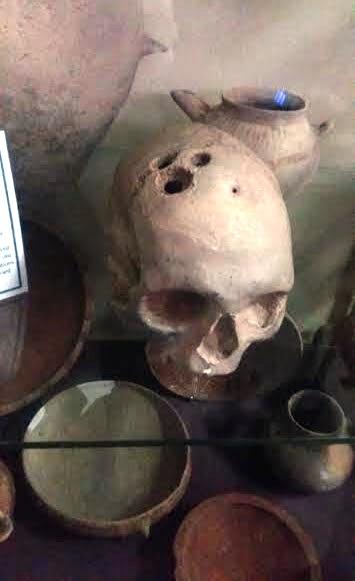 Bir bölümde de eski tıbbi aletler sergileniyor. Bu kafatasının üzerinde üç tane delik bulunuyor. Bu akıl hastalıklarının ve beyin ödeminin tedavisinde kullanılan bir yöntemmiş. İnce metal çubuklar ile kafatasında açılan bu delikler ile beyinde belli bölgeleri işlevsiz hale getirerek ya da ödemin boşaltılması ile baskıyı azaltarak tedavi sağlıyormuş.