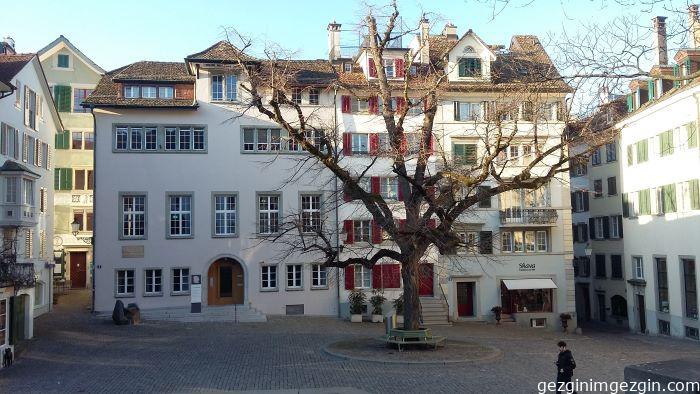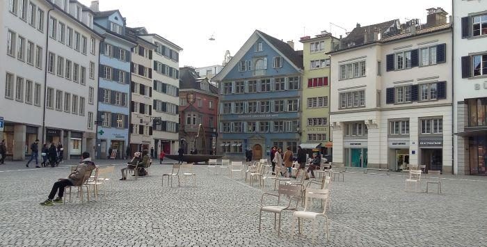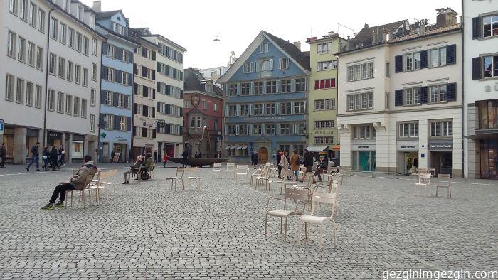 Augustıner-Gasse’ye çok yakın Grossmünster Meydanı. Diğer ülkelerde görmediğimiz bir uygulama ile karşılaşıyoruz; meydanlara halkın oturması için sandalyeler yerleştirilmiş.